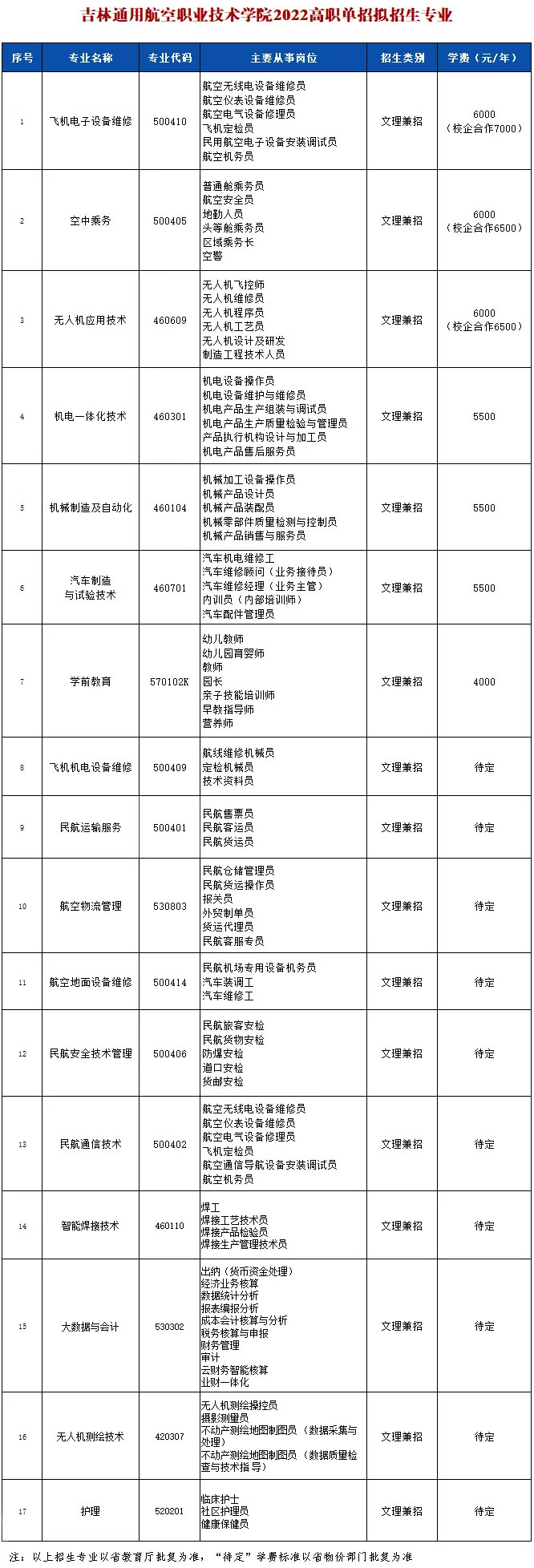 高三的莘莘學(xué)子即將迎來2022年高職單招文化素質(zhì)考試,為方便考生了解、掌握我院招生信息,現(xiàn)將吉林通用航空職業(yè)技術(shù)學(xué)院2022年擬招生專業(yè)公布如下: