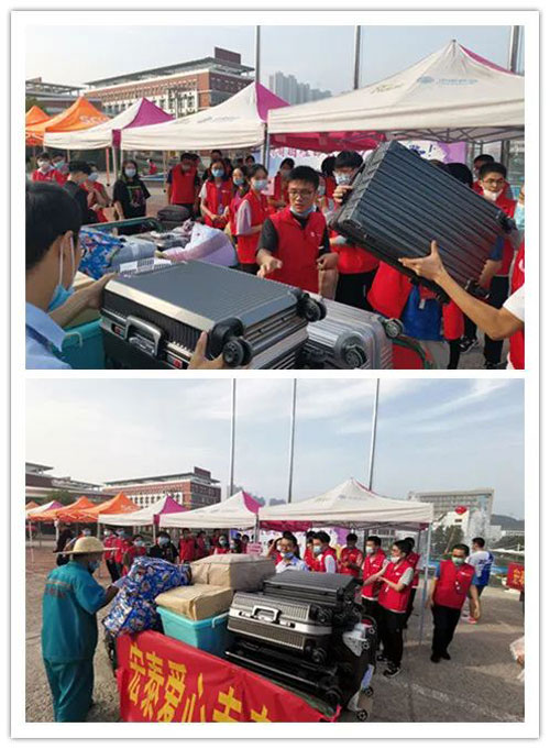 特殊時期,家長送孩子只能到指定區(qū)域,之后由咱們的“紅馬甲”志愿者引領學生進行報到,并進行行李搬運。各位家長們盡管放心,這也是孩子們開啟獨立生活的第一步。