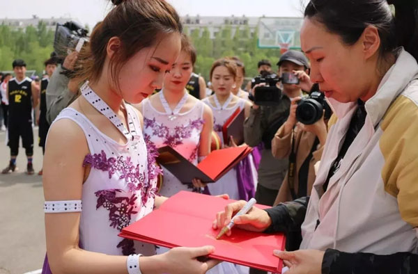 聽聞苗立杰的到來,同學(xué)們熱情高漲,紛紛涌向籃球場。苗立杰一踏進(jìn)籃球場,就收到了大家熱烈的掌聲和歡呼聲,感受到了家鄉(xiāng)學(xué)子的熱情,感受到了青年學(xué)生對她的喜愛。苗立杰對?;@球隊(duì)員進(jìn)行了耐心的指導(dǎo),告訴隊(duì)員們要保持一個良好的心態(tài),她與隊(duì)員們親切合影留念,并為隊(duì)員們簽名。接過苗立杰親筆簽名的籃球,隊(duì)員們都很激動,紛紛表示會以青年人昂揚(yáng)的姿態(tài)去拼搏、去奮斗、去挑戰(zhàn)每一場比賽,創(chuàng)造屬于自己的未來。隨后,學(xué)校理事長李寶山為苗立杰頒發(fā)聘書,聘請苗立杰為?;@球隊(duì)榮譽(yù)教練。
