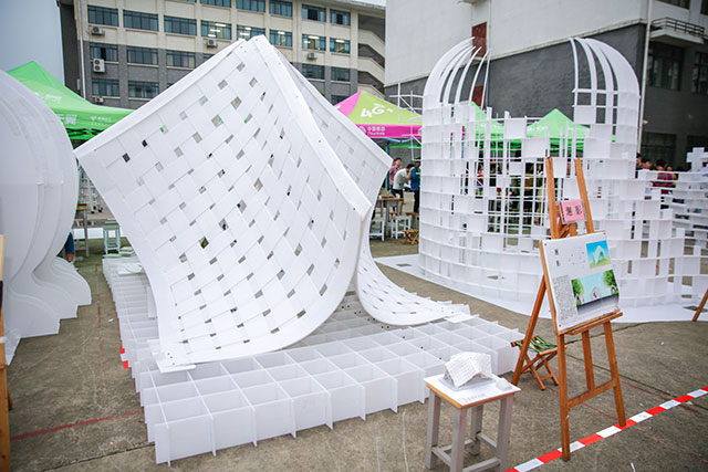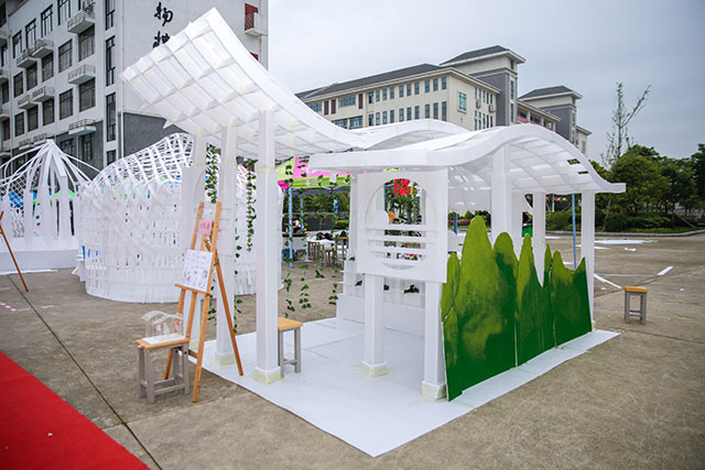 比賽充分激發(fā)和調(diào)動(dòng)了學(xué)生們進(jìn)行建筑設(shè)計(jì)的熱情和創(chuàng)造力。在比賽現(xiàn)場(chǎng),學(xué)生團(tuán)隊(duì)拓展思維、同心協(xié)力,連續(xù)創(chuàng)作8小時(shí)。建造完成后,一座座名為“山語(yǔ)”、“川戀”、“曲水流觴”、“水秀山黛”等形態(tài)生動(dòng)又充滿藝術(shù)氣息的中空板建筑屋呈現(xiàn)在大家眼前,其創(chuàng)意與造型令在場(chǎng)觀眾贊嘆不已。在評(píng)委評(píng)分環(huán)節(jié),各校參賽選手和老師們也相互觀賞作品,共同交流和探討建造技術(shù)經(jīng)驗(yàn)。