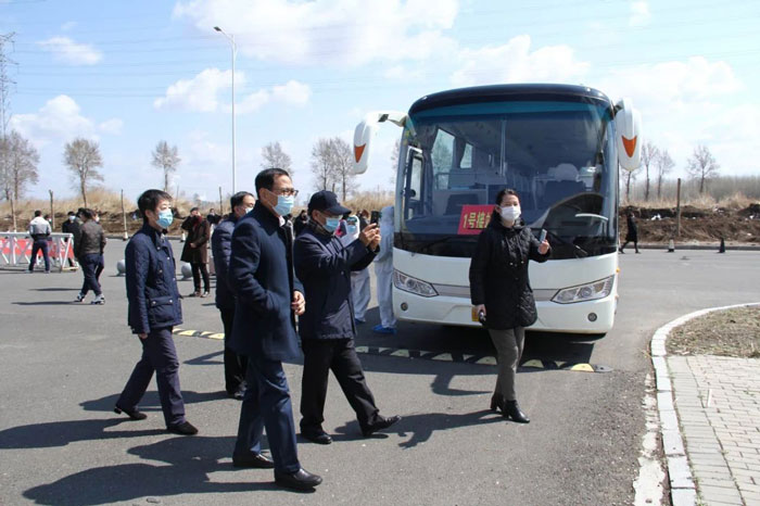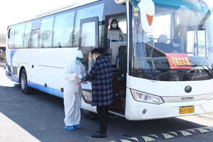 接站前先對接站車進行全面消毒,模擬人員(12人)排隊乘車配合測溫登記、就坐(一人兩座),體溫出現異常的學生迅速上報,下車前再次測溫,檢測表由隨行人員交至南門保衛(wèi)人員。