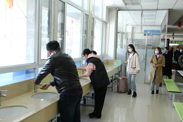 在學生用餐環(huán)節(jié)演練中,學校實行錯時錯峰間隔就餐制度,由專門人員指引間隔一米以上有序排隊進入食堂,經消毒、洗手等流程和體溫檢測合格后,方可進入食堂就餐。同時,為防止就餐期間飛沫傳播,就餐者之間需保持一米以上距離,隔座用餐,同向相坐。并對食堂進行定時消殺,保證師生就餐安全。