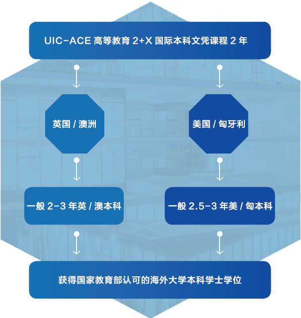 經(jīng)國家留學(xué)基金管理委員會同意,我校引進(jìn)“國際本科學(xué)術(shù)互認(rèn)課程(International Scholarly Exchange Curriculum(Undergraduate),簡稱ISEC)”,我校在此課程基礎(chǔ)上設(shè)立本校的國際化項(xiàng)目“UIC-ACE高等教育2+X國際本科文憑課程”,由UIC直屬部門繼續(xù)教育中心(ACE)承辦與管理,為有志通過本課程邁向世界各國名校的學(xué)子們提供優(yōu)質(zhì)的教育平臺。