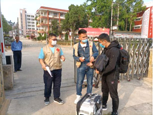校園門口,積極的志愿者們和老師一起從早上一直持續(xù)到晚上十點(diǎn),甚至為了等待火車晚點(diǎn)的同學(xué)等到11點(diǎn)半。帶著口罩隨時(shí)隨地的接待歸來的學(xué)生們!他們測(cè)量體溫、查驗(yàn)健康碼和行程卡,幫助行李多的同學(xué)搬運(yùn)行李,雖然滿頭的汗水,但是他們的笑容比陽光還燦爛。