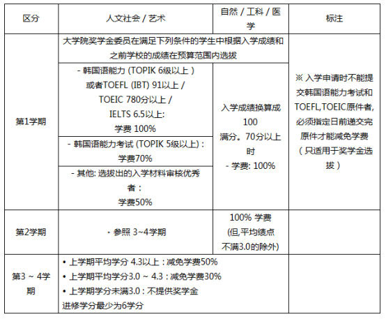 對于外國人特別招生全體合格者,第一學期只需付學費及注冊費全額的50%,從第二學期至第八學期(插班生從第二學期至第四學期),若前一學期取得12學分以上,且平均成績在70分以上,可繼續(xù)只交學費全額的50%。學校將在1年內繼續(xù)每月支付每個學生16萬韓幣(共相當于1年宿舍費)。