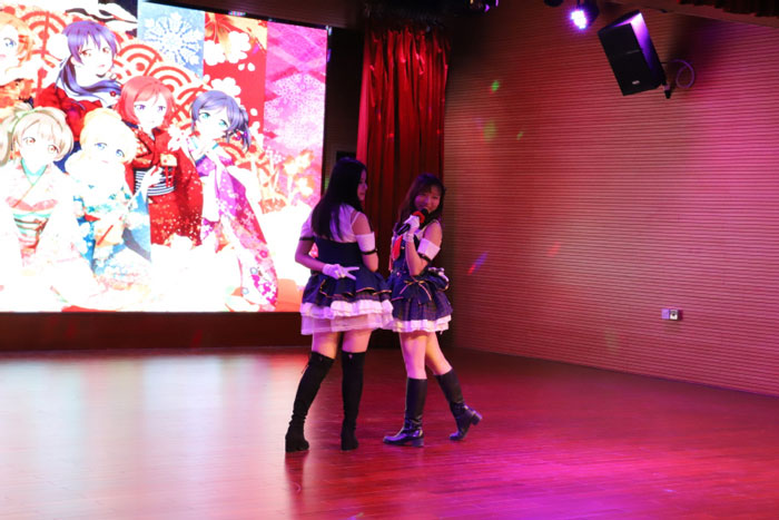 不僅學(xué)生們多才多藝,學(xué)院教職工們也是非常有才!英文、德文、日文節(jié)目悉數(shù)亮相,戈淑珍老師聲情并茂地獻(xiàn)上一首歌德著名的《致我的母親》德文朗誦,鐘楚君、謝慧怡兩位老師造型“卡哇伊”獻(xiàn)唱《star Dash》在場內(nèi)掀起一股日本旋風(fēng);江嘉穎老師帶來的獨(dú)唱《When you say nothing at all》贏得了同學(xué)們熱烈的掌聲!
