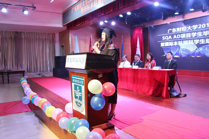 5月31日下午2點30分,國際學(xué)院在學(xué)生活動中心隆重舉行了廣東財經(jīng)大學(xué)2019屆SQA AD項目學(xué)生畢業(yè)典禮暨國際本科預(yù)科學(xué)生結(jié)業(yè)典禮。教育部留學(xué)服務(wù)中心國際處韓三軍副處長、孫毓鵬科長、教育部留學(xué)服務(wù)中心SQA AD項目負責(zé)人張麗輝女士、學(xué)校國際交流與合作處李新博處長、國際學(xué)院林莉院長、國際學(xué)院譚玉祥書記、全體2019屆SQA AD項目、國際本科預(yù)科畢業(yè)生及家長,全體國際學(xué)院教職工及嘉賓140多人出席本次活動。