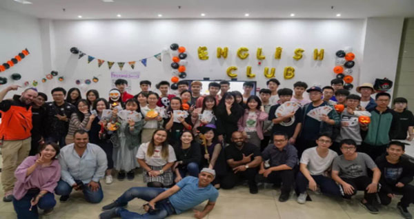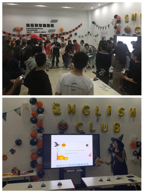 10月31日晚上8點(diǎn)45分,國際教育學(xué)院“英語俱樂部暨2019國際文化節(jié)預(yù)熱活動(dòng)”在實(shí)驗(yàn)中心一樓大廳隆重舉行。平日空曠素凈的實(shí)驗(yàn)中心大廳被精心裝扮,50多位國際教育學(xué)院18、19級學(xué)生和外籍留學(xué)生參與了活動(dòng)?,F(xiàn)場氣氛熱烈,吸引了眾多下晚課的同學(xué)駐足圍觀,為即將成立的英語俱樂部點(diǎn)燃了第一把火。