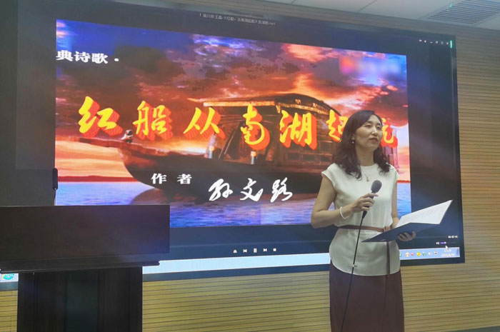 培訓(xùn)部辦公室主任王晶以“紅船,從南湖起航”為題進(jìn)行詩歌朗誦,通過講述紅船故事,真情謳歌中國共產(chǎn)黨成立100周年來取得的偉大成就。她表示,SQA項(xiàng)目的全體學(xué)生要通過了解中共“一大”在南湖游船上勝利閉幕這一歷史事件,深刻學(xué)習(xí)共產(chǎn)黨人“開天辟地、敢為人先”的首創(chuàng)精神和“堅(jiān)定理想、百折不饒”的奮斗精神,并將其轉(zhuǎn)化為發(fā)揮青春力量、為中國特色社會主義事業(yè)奮斗的信念和力量。
