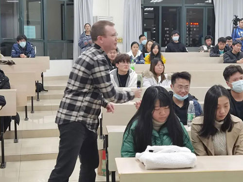 Ben Keegan老師還詳細(xì)地介紹西方餐桌禮儀。Ben Keegan老師為現(xiàn)場的同學(xué)們生動(dòng)、風(fēng)趣地描述了他的親身經(jīng)歷,使同學(xué)們進(jìn)一步了解了在西方國家如何正確地就餐。