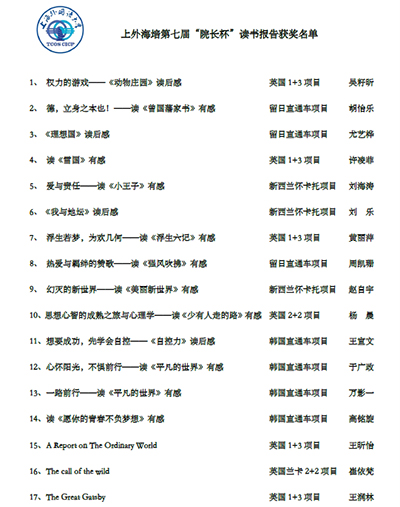 陳立青老師宣讀了獲獎名單并作總結講話。陳老師強調:自律即自由。在以美德作為根基的情況下,去領悟真正的自由與責任。讀書是人一生不可放棄的事情,是人的根基。她希望學生們能夠從學期初就定下適合自己的讀書計劃,形成每周寫讀書日志的習慣,經過一學期的積累,再進入到讀書報告會的階段,就能夠有更多的收獲。