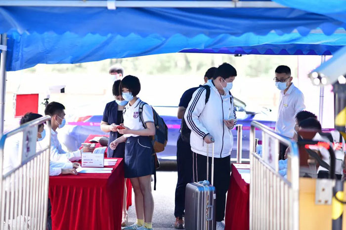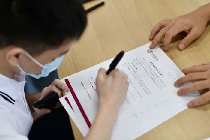 為全面防控疫情,確保新生入學報到的安全、有序,學校嚴格按照上海市最新防疫要求,組織學生上下午錯峰報到。所有進校人員需在校門口測量體溫,出示行程碼、健康碼,并簽署《新冠疫情防控個人承諾書》;同時,近14日離滬的學生及隨行家長,還需出示48小時內核酸檢測陰性證明。
