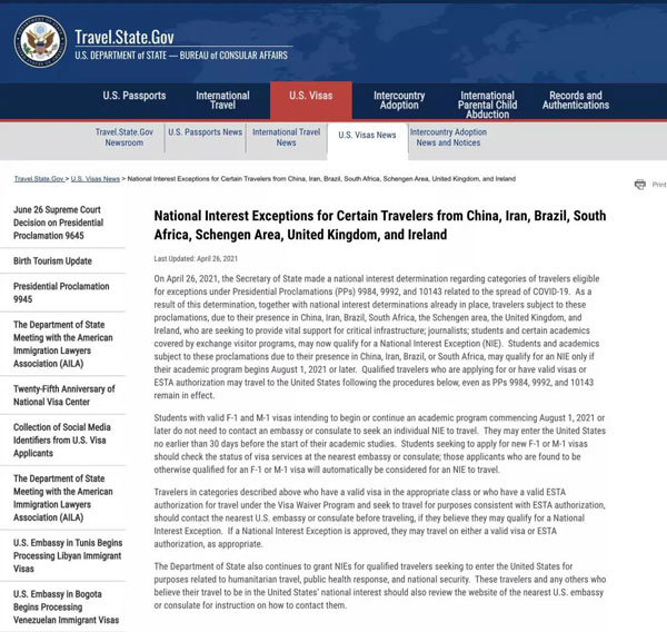 此次F/M類簽證旅行限制的解除對象除了中國以外,還包括伊朗、巴西、南非、申根地區(qū)、英國和愛爾蘭。