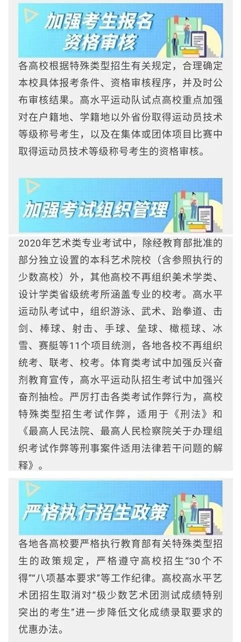 教育部公布《2020年普通高等學(xué)校招生工作規(guī)定》,以及各高校根據(jù)特殊類型招生有關(guān)規(guī)定,合理確定本校具體報考條件、資格審核程序,并及時公布審核結(jié)果。高水平運動隊試點高校重點加強對在戶籍地、學(xué)籍地以外省份取得運動員技術(shù)等級稱號考生,以及在集體或團體項目比賽中取得運動員技術(shù)等級稱號考生的資格審核。