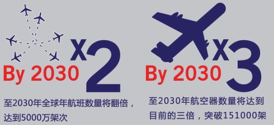 圖1:ICAO估計(jì),2030年前全球每年的航班數(shù)量將翻倍,達(dá)到5000萬(wàn)架次,航空器數(shù)目將達(dá)到目前的三倍,突破151000架。